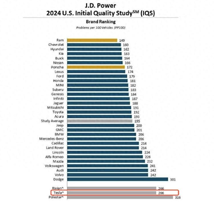 而大家最為關注的特斯拉,盡管在銷量上表現(xiàn)不俗,但是在這份排行榜上,僅位列倒數(shù)第三,每100輛車的問題數(shù)高達266,遠高于平均數(shù)。實際上,J.D.Power自2022年將特斯拉納入其研究范圍,之后在新車質(zhì)量方面,表現(xiàn)一直不佳。