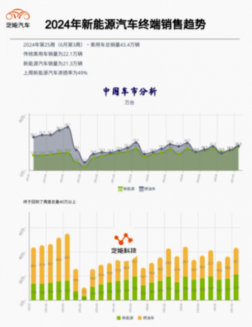 2024年25周,6月第三周(17日-23日),乘用車總銷量為43.4萬,這是一個比較好的數字,其中: