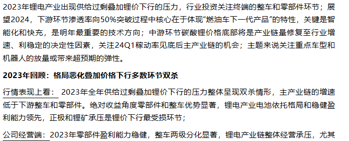中信建投證券研究認為,2023年鋰電產業出現供給過剩疊加鋰價下行的壓力,行業投資關注終端的整車和零部件環節;2024年,下游環節滲透率向50%突破過程中核心在于體現“燃油車下一代產品”的特性,關鍵是智能化和快充,是今年最重要的技術方向;中游環節碳酸鋰價格底部將是產業鏈量修復至行業增速、利穩定的決定性因素。