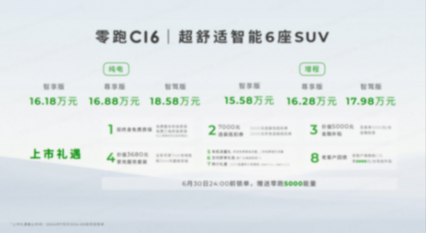 零跑C16上市指導價15.58-18.58萬元。其中,C16純電車型520智享版指導價16.18萬元、520尊享版指導價16.88萬元、520智駕版指導價18.58萬元; C16增程車型200智享版指導價15.58萬元、200尊享版16.28萬元、200智駕版17.98萬元;在上市政策有效期內(nèi)繳納5000元定金,享整車、三電雙終身質(zhì)保,及價值至高2萬元的上市禮遇。