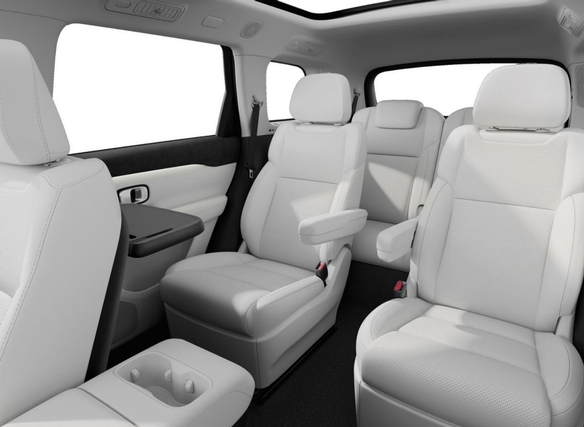然后看eπ008。車身尺寸是5002/1972/1732mm,軸距為3025mm,體格和軸距要比另外兩款車略大,也提供2-2-2的6座布局;一二排支持電動調節、加熱、通風和電動位置記憶,二排多了腿托伸縮功能,但小桌板需要選裝實現。