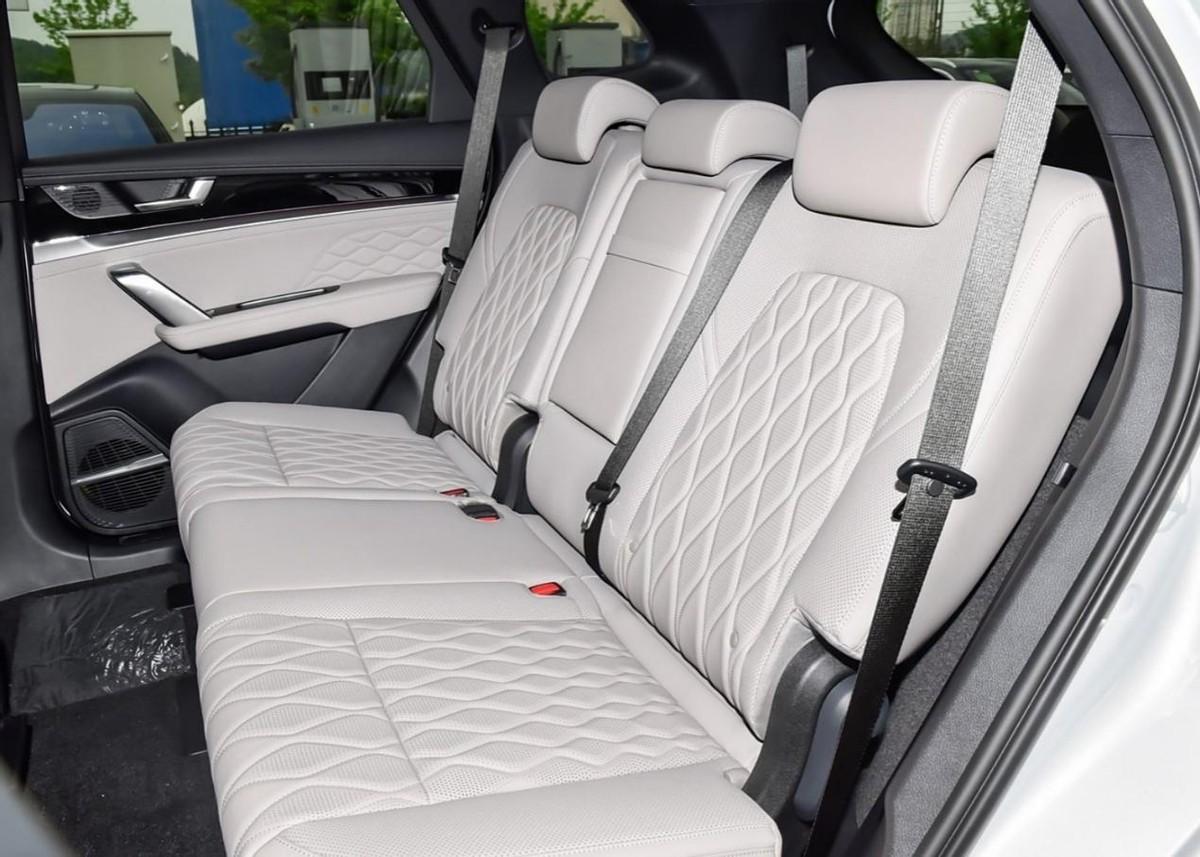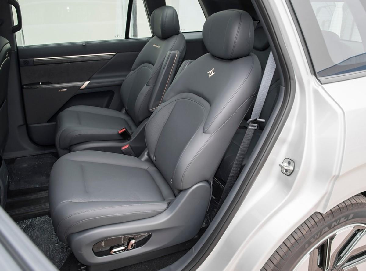 它的三排空間體驗也比較寬敞,和零跑C16有的一拼,而且第二排帶腿托,舒適性不錯,不過沒有小桌板。