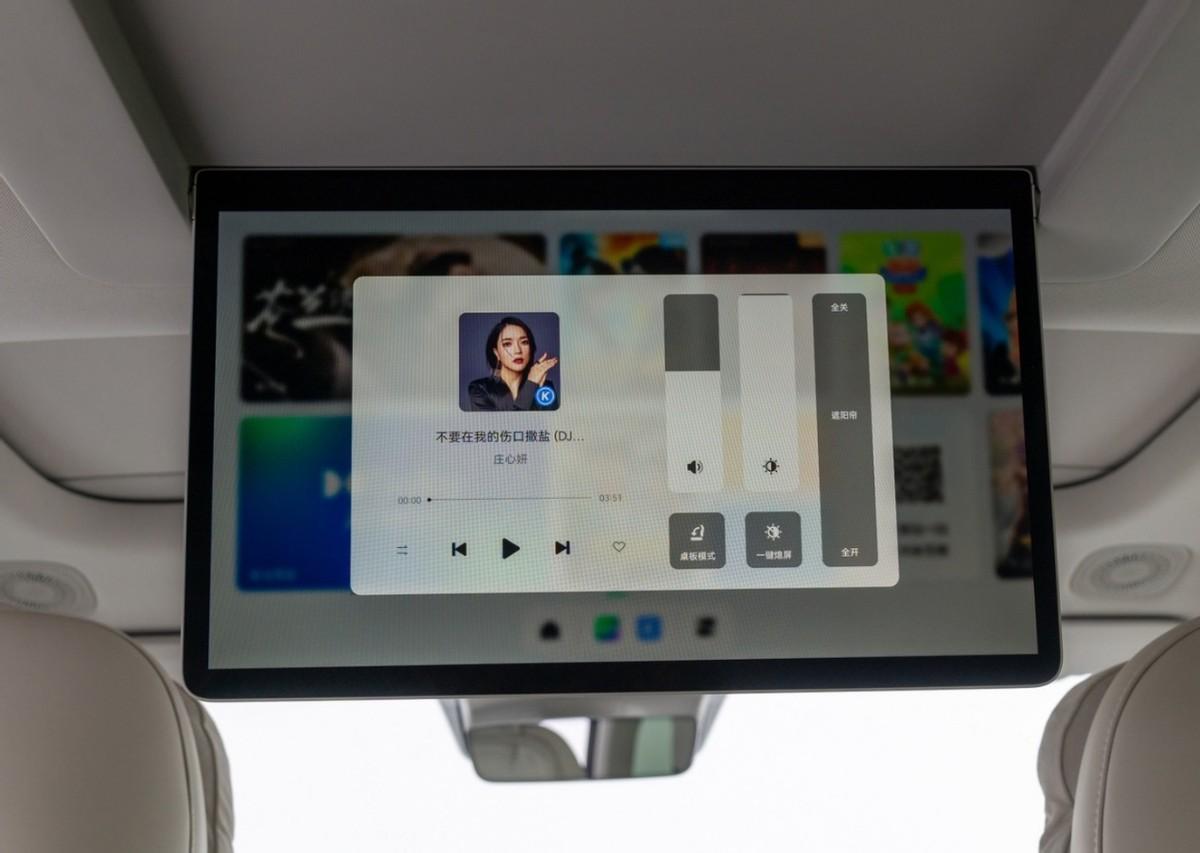 后排有一塊吸頂15.6英寸液晶屏,支持前排中控屏、后排液晶屏畫面同步投射,可以通過觸控、語音、手機APP三種方式調節液晶屏,在吸頂屏開啟狀態下,如果車輛處于D擋模式,前排大屏幕會通過后置攝像頭抓取車輛后方影像進行投屏,解決了后屏遮擋后視鏡的問題。