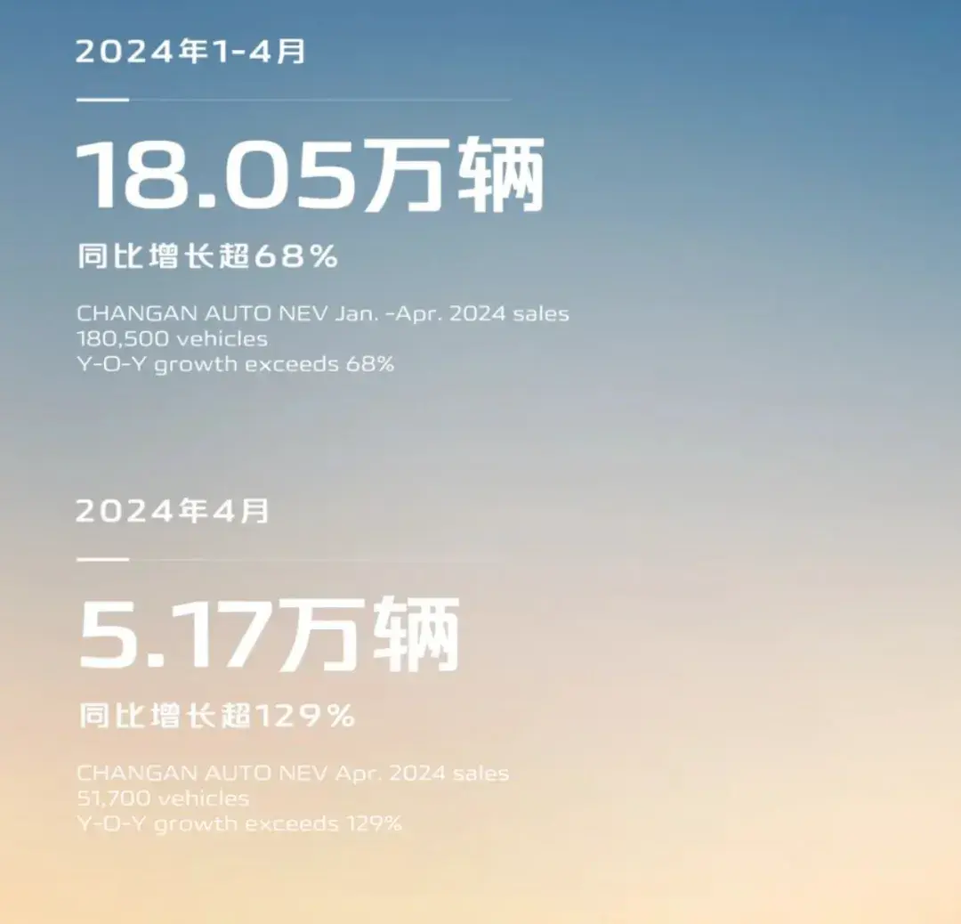 長安汽車1-4月銷量共計18.05萬輛,同比增長超68%。4月銷量共計5.17萬輛,同比增長超129%。其中,1-4月長安汽車自主品牌新能源銷量18.05萬輛,同比增長超68%。4月新能源銷量5.17萬輛,同比增長超129%。從各個品牌來看,長安啟源4月交付11833輛,累計銷量突破88,000輛,深藍汽車4月完成交付12,744輛。