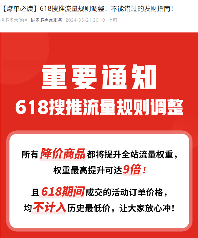 以拼多多為例,在今年的“6·18”大促期間,其調整了搜推流量規則,所有降價商品都將提升全站流量權重,權重最高提升可達9倍。