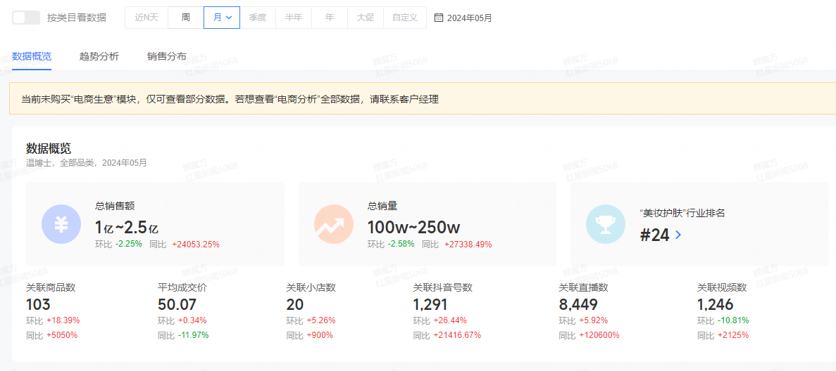 紅星資本局注意到,2023年,溫博士的知名度幾近于零;今年以來,溫博士在抖音平臺上集中發力,其銷售額爆發式增長,且一度超越了雅詩蘭黛等國際品牌。