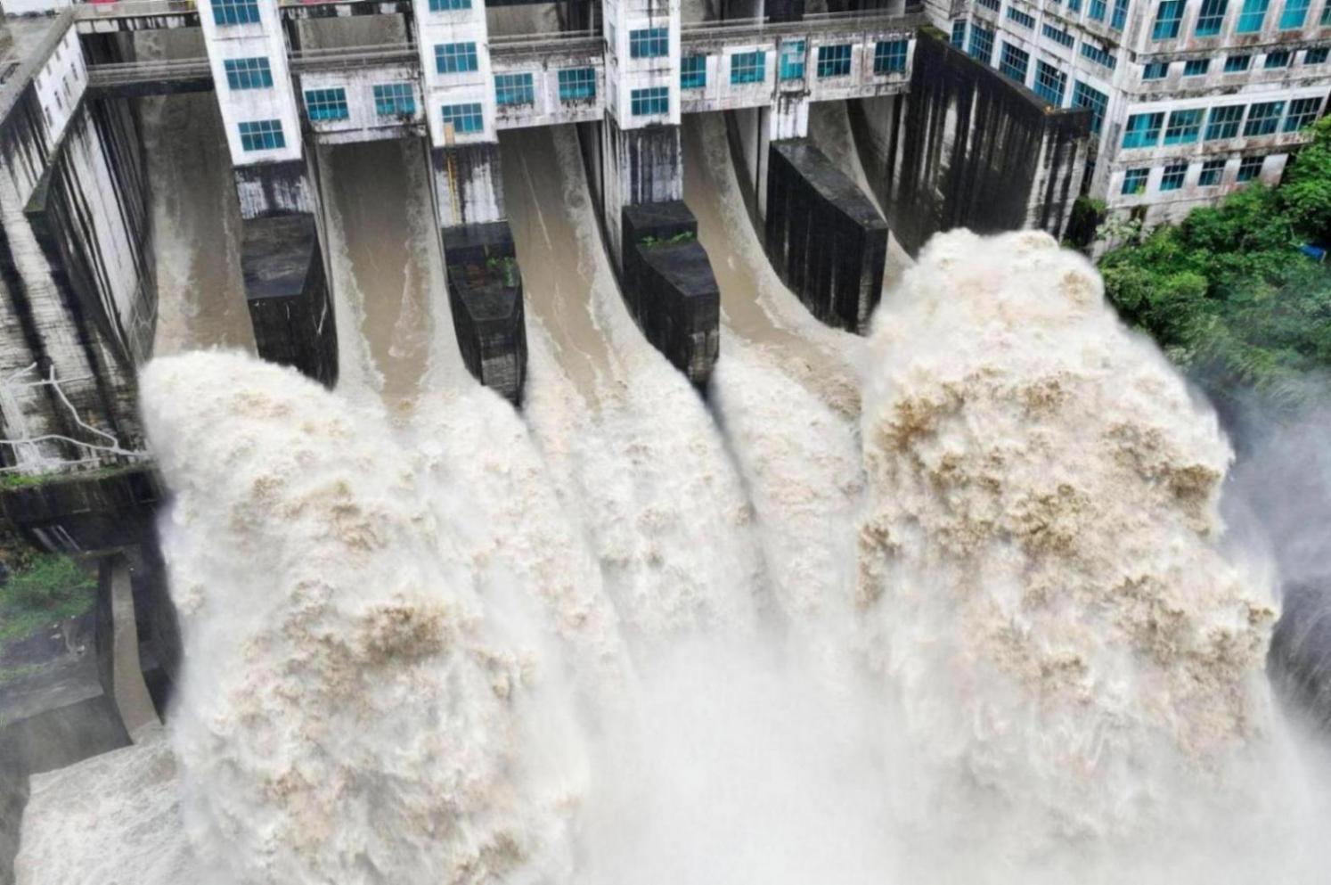 2024年6月28日,重慶,酉陽土家族苗族自治縣蒼嶺鎮,大河口水電站正在進行泄洪。