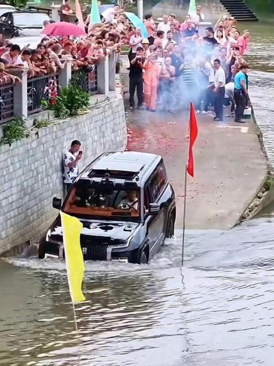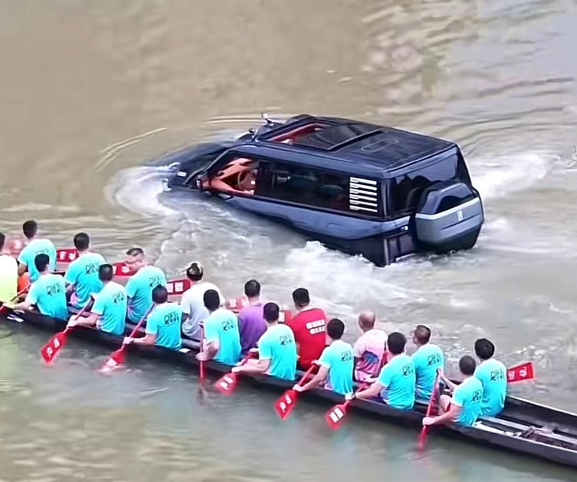從拍攝者們上傳的視頻來(lái)看,“迪王”仰望U8在岸上開啟涉水模式后,直接說(shuō)干就干,優(yōu)哉游哉般“游”到了河里的龍舟旁,甚至打算跟龍舟隊(duì)在河里賽一場(chǎng)水上漂移。