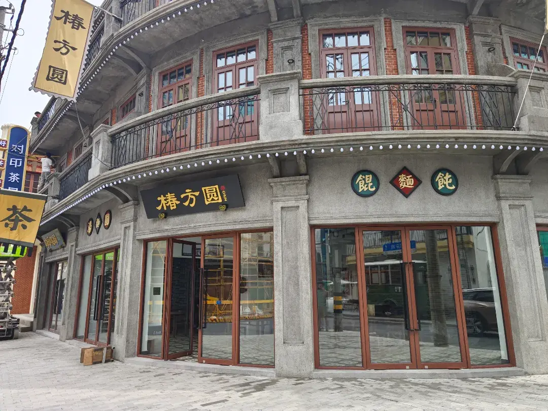 記者看到,乍浦路北海寧路口的店鋪已經掛上了椿方圓和對印茶局的招牌,店招和建筑外立面設計很有年代感。