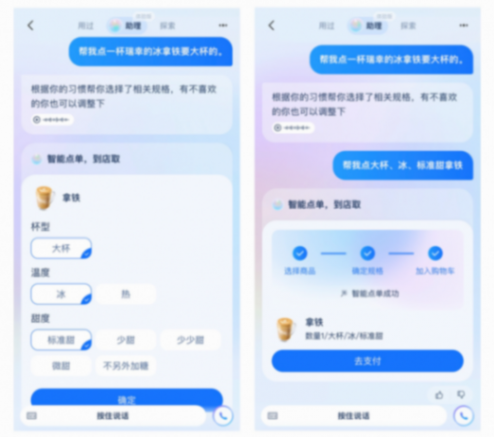 據悉,AI智能點單這一新功能,已在支付寶App開啟測試,首批支持星巴克、瑞幸、霸王茶姬、蜜雪冰城等11個茶飲品牌的支付寶小程序。用戶通過支付寶智能助理下達指令,比如“幫我點一杯瑞幸的大杯冰拿鐵”,AI便會進入小程序自動下單,用戶確認并付款后,就能到附近的線下門店取到咖啡。