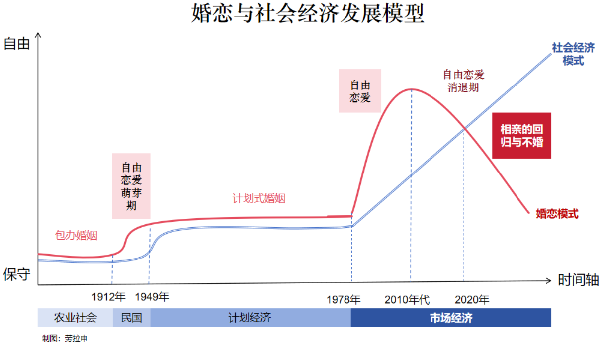 婚戀靠“計劃安排”還是“自由選擇”,通常取決于社會經濟模式是計劃還是自由。一般而言,社會經濟模式與婚戀模式呈正相關,計劃式婚姻與計劃經濟平行,自由戀愛與自由市場經濟平行。但21世紀后產生拐點,二者不再平行,變成錯位式負相關。市場經濟繼續自由向上,婚戀卻不再自由,而是回歸了計劃,并產生一種新現象:不婚。