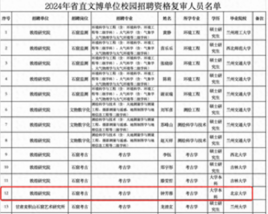 澎湃新聞注意到,今年6月下旬,敦煌研究院發布了《關于2024年省直文博單位校園招聘資格復審及面試的通知》。該通知提到:2024年省直文博單位校園招聘網上報名及資格初審已完成,按照工作程序,現對擬進入面試的應聘人員進行資格復審(名單見附件)。復試名單顯示,北大考古學專業本科畢業生鐘芳蓉應聘的為敦煌研究院的石窟考古崗位。