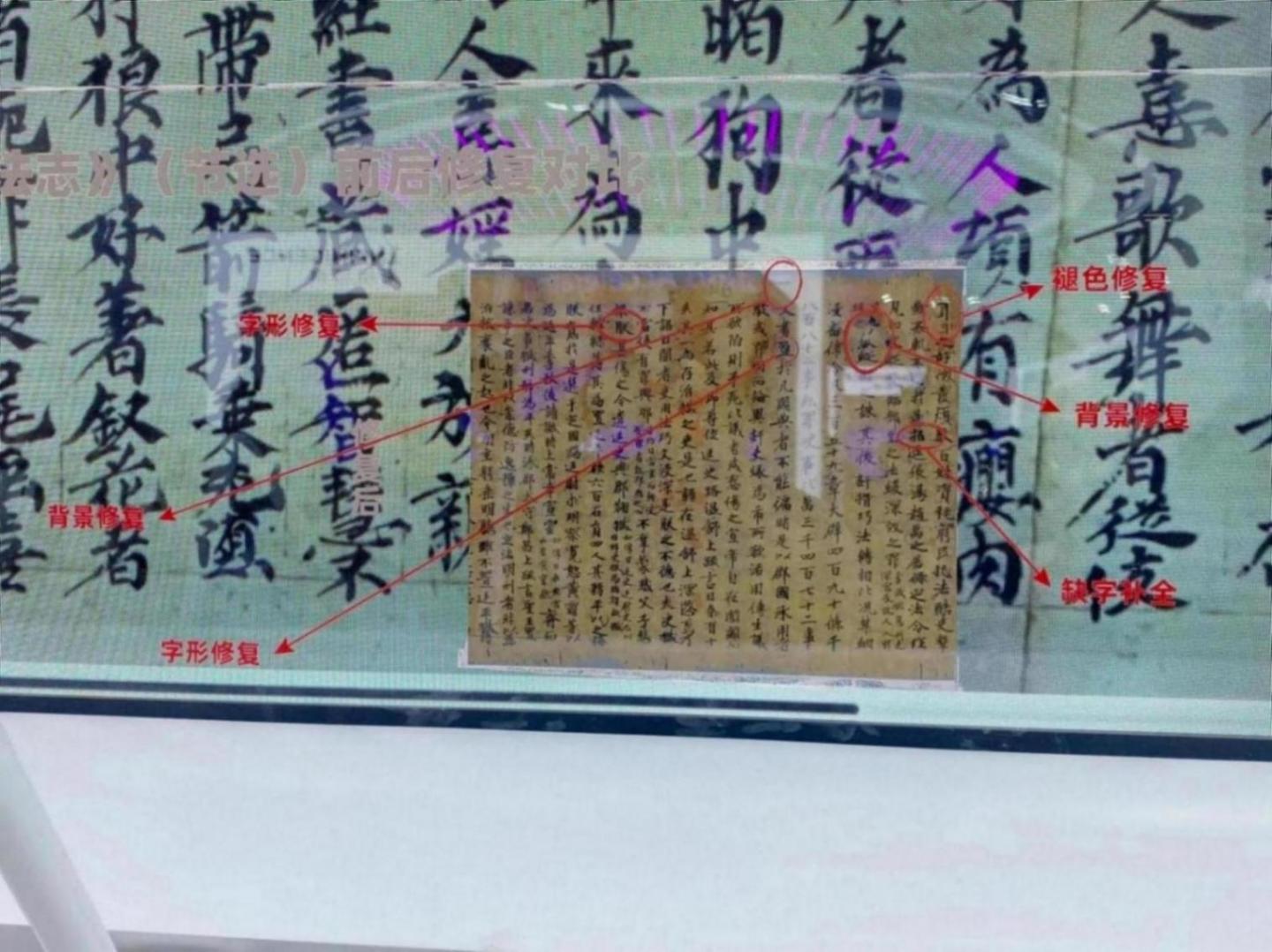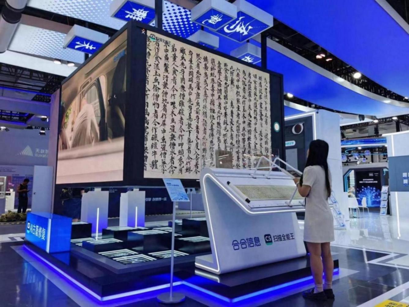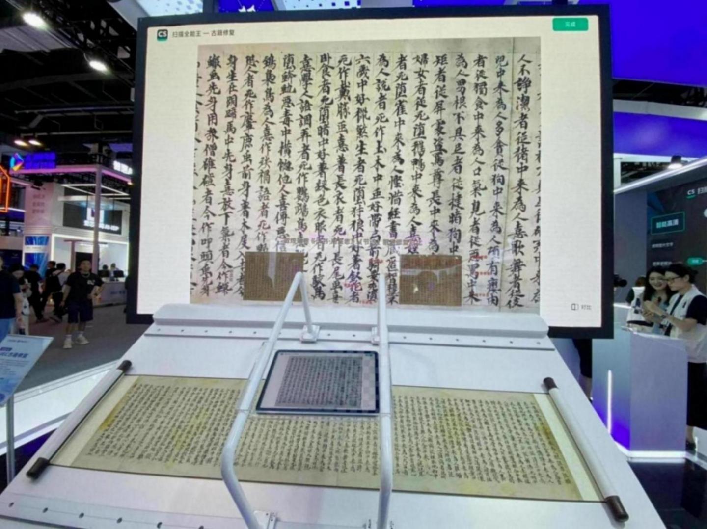 “你可以看一下,隨著我們滑軸的移動,(敦煌遺書)樣本卷軸的不同地方是有不同程度的缺損的,然后我們可以點擊滑軸上AI古籍修復模型的操作功能按鈕,就可以開啟修復工作。進行圖像處理之后,AI就會識別目前你想要修復的區域并進行自動定位,定位完之后,自動判斷這一區域需要修復的缺字或者字跡污損難辨認情況,修復完之后實現1:1的還原。” 合合信息展臺工作人員說,在修復時,AI古籍修復模型還會自動學習原版古籍的文字、筆畫風格(書法字體),以及頁面紋理,把缺損的文字按照原來的字體、色彩、背景加以修復還原,且能夠做到天衣無縫、看上去沒有“違和感”,在最大程度上確保了修復區域的文字風格和背景與原古籍的一致性。