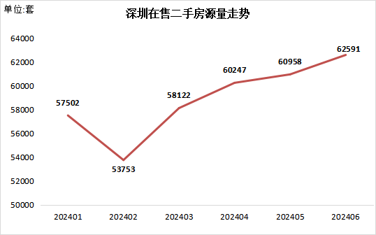 截至2024年7月1日,據(jù)深圳市房地產(chǎn)信息平臺公開在售二手房數(shù)量統(tǒng)計,深圳全市有效在售二手房源62591套,對比6月1日統(tǒng)計的60958套在售房源增加1633套,環(huán)比增長2.7%。從月度走勢看,在春節(jié)假期復工后,市場二手房在售量呈現(xiàn)持續(xù)增長態(tài)勢,當前量較春節(jié)假期間在售量增加近1萬套,反映年后在市場有所好轉的背景下,業(yè)主出售意愿在持續(xù)上升。