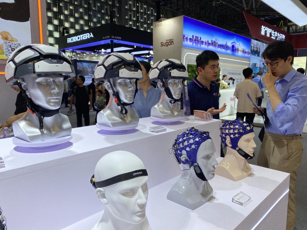 智能腦電圖機(jī)產(chǎn)品,參觀者可現(xiàn)場(chǎng)佩戴體驗(yàn)。澎湃新聞?dòng)浾?俞凱 圖