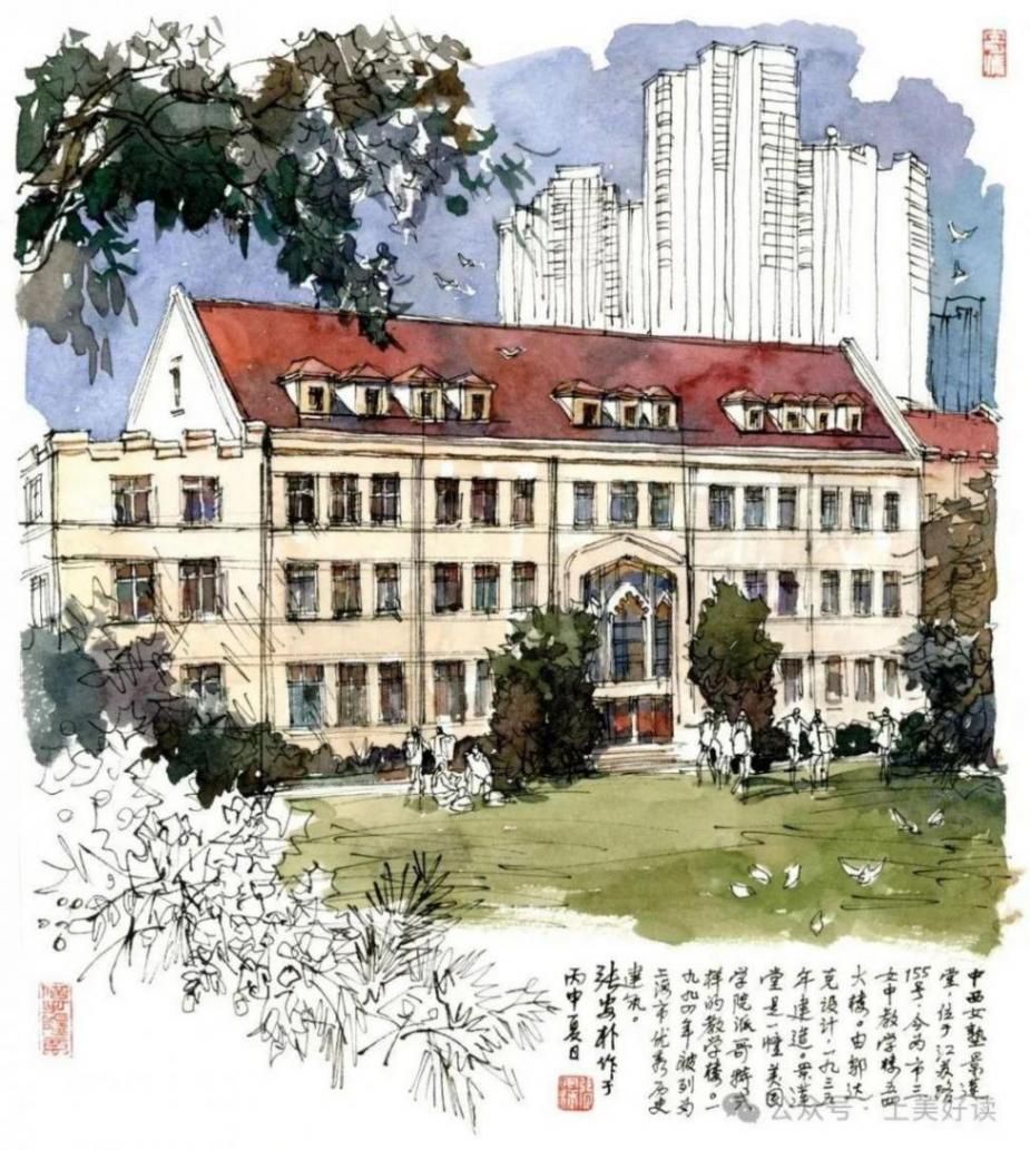 中西女塾景蓮堂(今市三女中教學(xué)樓五四大樓,江蘇路155號),是一幢美國學(xué)院派哥特式樣的教學(xué)樓,立面簡潔樸素,外墻面用水泥砂漿仿石材裝飾,雙坡硬山紅瓦屋頂。