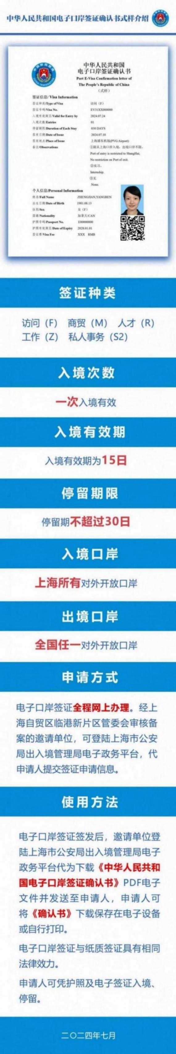 國家移民管理局決定,自即日起在中國(上海)自由貿易試驗區臨港新片區試點簽發電子口岸簽證。7月12日,澎湃新聞記者從上海市公安局獲悉,上海簽發我國首張電子口岸簽證。