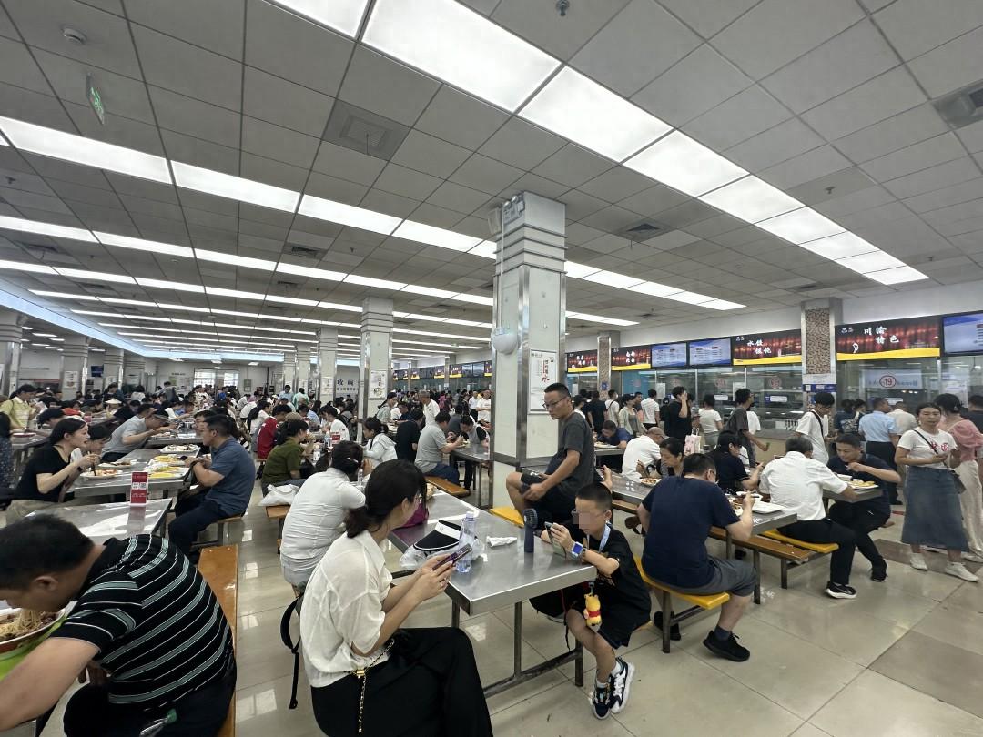 澎湃新聞記者采訪了解到,該食堂在就餐高峰期(中午11:15-12:30)只對校內師生開放供餐,因此,在就餐高峰期來到食堂的家長和孩子,只能等到12點半后,再涌向打飯窗口。另一方面,有暑假在校學生認為,校外就餐人員過多會擠占原本屬于師生的空間,但影響沒有那么嚴重。