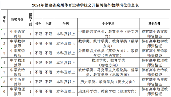 為保障教育教學(xué)工作需求,我校決定組織開展2024年福建省泉州體育運動學(xué)校公開招聘編外教師工作,現(xiàn)將有關(guān)事項公告如下: