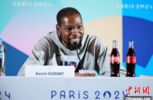 25日,美職籃球星杜蘭特在巴黎奧運會媒體中心接受采訪。趙文宇 攝