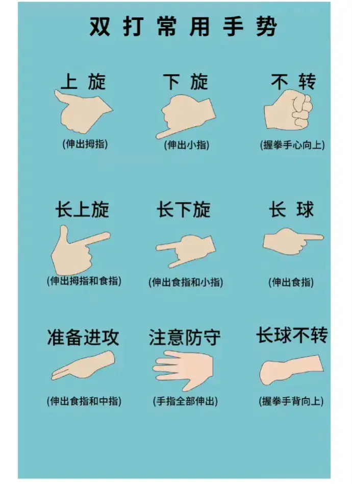 伸出拇指是上旋,伸出小指是下旋,握拳手心向上是不轉(zhuǎn),伸出拇指和食指是長(zhǎng)上旋,伸出食指和小指是長(zhǎng)下旋,伸出食指是長(zhǎng)球,伸出食指和中指是準(zhǔn)備進(jìn)攻,五指全部伸出是注意防守,握拳手背向上是長(zhǎng)球不轉(zhuǎn)。