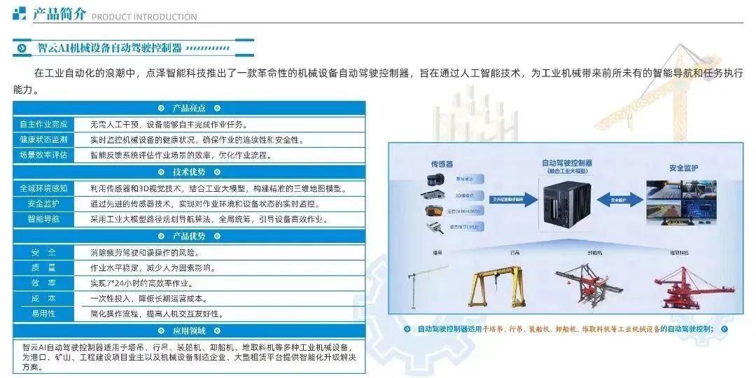 點澤智能科技此次展出的智云AI機械設備自動駕駛控制器,是一款具有突破性的高科技產品。該控制器基于多傳感器數據融合和端到端感控一體化世界大模型,實現了對三維時空對象、地點和事件的建模和推理。在港口、礦山、工程建設等領域,這款產品優化生產流程,免去了高危作業,工作人員只需專注在監控督察,從而降低管理成本,提高運營績效。