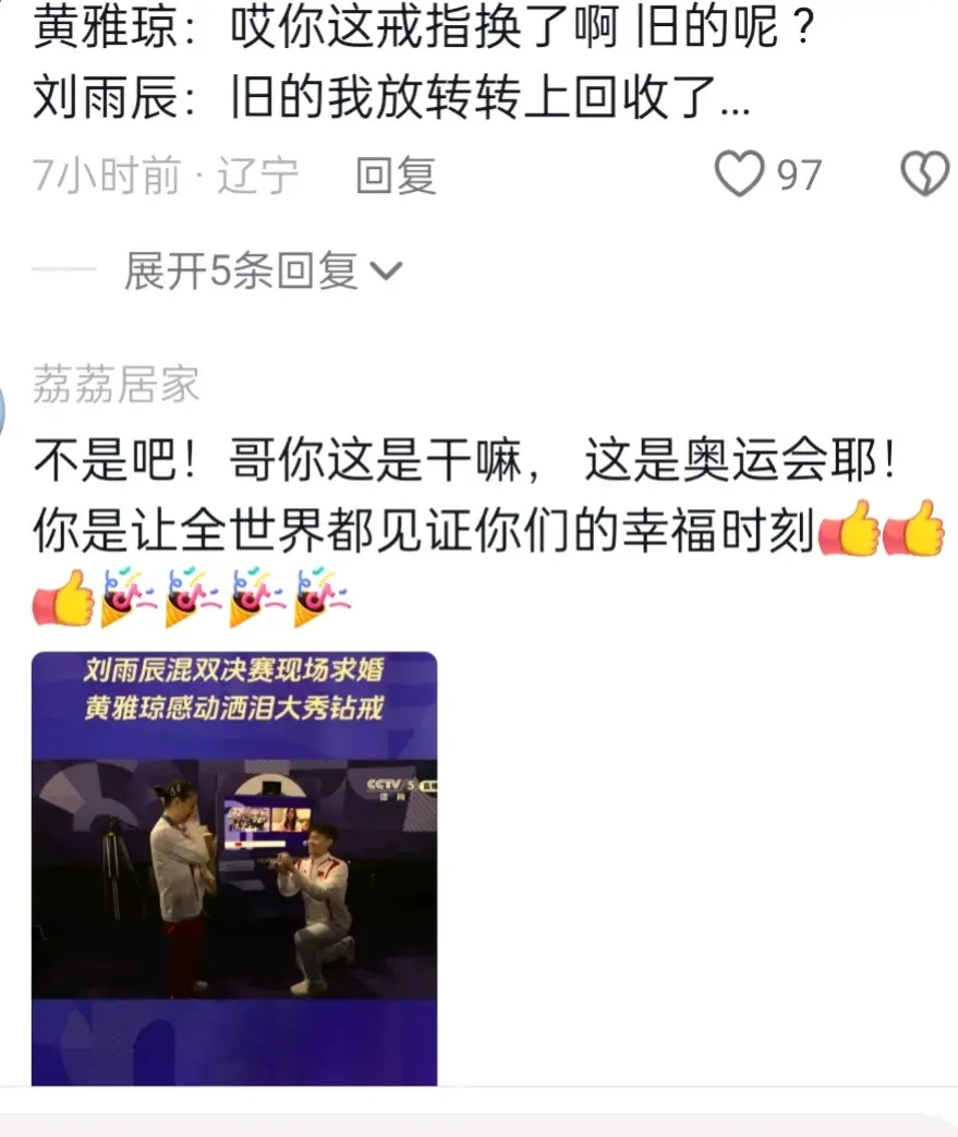 誰說中國人不懂浪漫,浪漫巴黎下,在得到奧運會金牌下,全世界矚目下見證求的求婚,誰不會尖叫呢?奧運會當著全世界的面。從此巴黎奧運會首枚鉆戒,我宣布王雅婷才是自己的大女主,左手金牌,右手鉆戒,愛情事業兩不耽誤。祝福劉雨辰跟王雅瓊一直幸福下去吧!