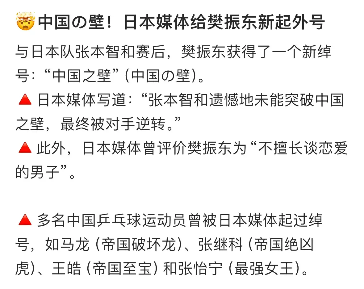 樊振東4比3逆轉張本智和后,日本媒體又開始起外號了,這次給小胖起的是“中國之壁”!