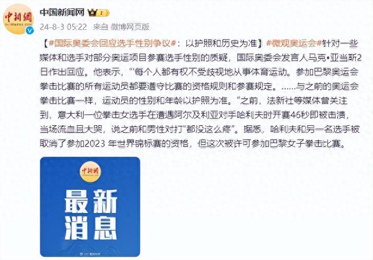 此次阿爾及利亞選手哈利夫被允許參加巴黎女子拳擊比賽引發了媒體和人們的廣泛討論,這引發了人們對運動員性別認定標準的質疑。