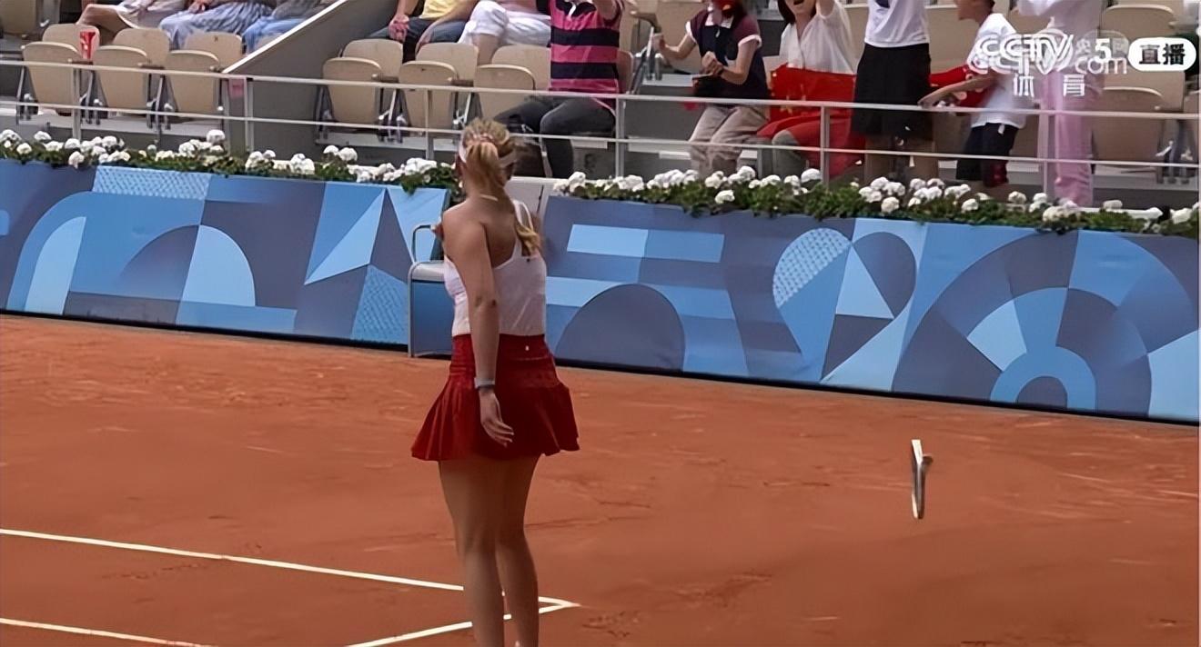 在關鍵的第8局,鄭欽文連續出擊,拿到2個破發點,對手維基奇被打到心態失衡,怒摔球拍。