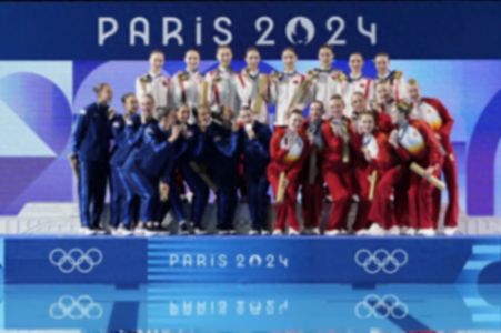 當地時間8月7日,巴黎奧運會花樣游泳集體項目決賽后的頒獎儀式,金牌得主中國隊、銀牌得主美國隊和銅牌得主西班牙隊合影留念。圖源:美媒