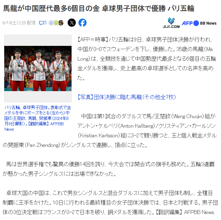 日媒更是直言,馬龍是中國乒乓歷史上第一位6金王。