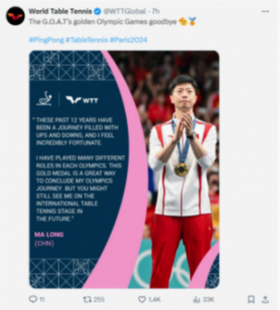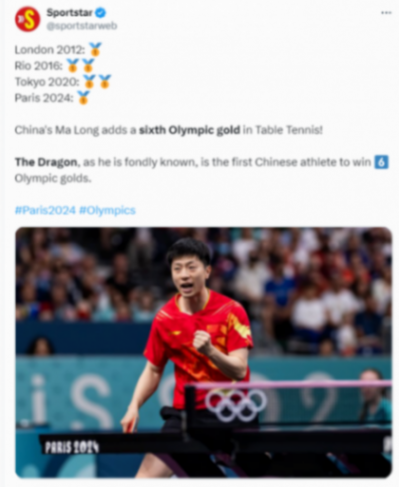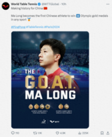 WTT官方認證馬龍是乒壇GOAT,他再度創造中國歷史,他成為奧運會歷史上第一個在任何項目都拿到金牌的選手,馬龍四屆奧運會拿下了6枚金牌前無古人。