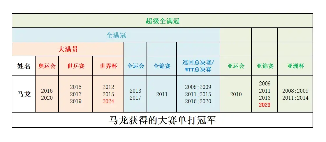 除了上面提到的榮譽,馬龍還是第一位男子乒乓球全滿貫運動員(第二位是樊振東,前幾天剛剛完成超級全滿貫),大賽戰(zhàn)績也可以說是別人也是很難超越的。2次奧運會單打冠軍,3次世乒賽和3次世乒賽單打冠軍,2次全運會,1次全錦賽,6次總決賽,1次亞運會,4次亞錦賽,4次亞洲杯冠軍。差一個亞運會和全錦賽,就可以實現(xiàn)雙全超級全滿貫。