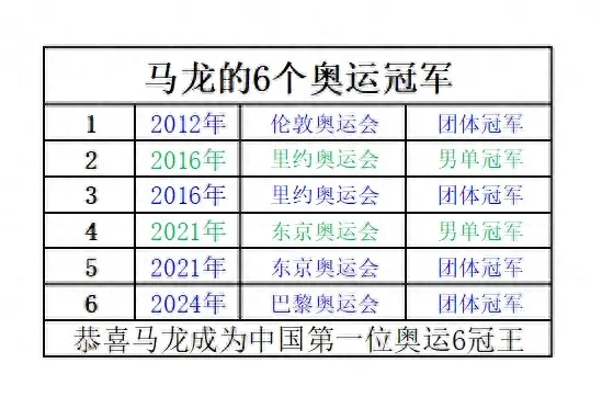同時值得一提的是,收獲本屆巴黎奧運會男團金牌后,馬龍成為中國首位奧運六金王。馬龍參加四屆奧運會,四次團體,兩次男單,都獲得了冠軍。分別如下: