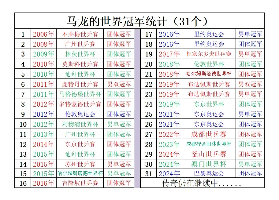 馬龍,可以說是傳奇運動員的代表,1988年出生的他,到現(xiàn)在還一直保持在很高的世界排名和競技水平,世界排名一直還是穩(wěn)居前四名。除了還一直代表國乒參加奧運,世乒賽和世界杯的團體比賽外,2024年,馬龍還獲得了三大賽之一的世界杯的男單冠軍。到目前為止,馬龍獲得了31個世界冠軍。其中男單冠軍8個,男雙冠軍2個,團體冠軍21個(6個奧運冠軍,14個世乒賽冠軍,11個世界杯冠軍)。是國乒獲得的世界冠軍數(shù)量最多的一位運動員。
