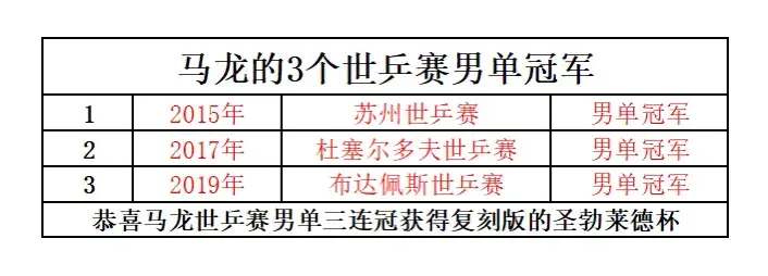 此外,馬龍的世乒賽男單三連冠,也讓他獲得復刻版的圣勃萊德杯,是繼王楠之后,第二位獲得復刻杯的運動員(世乒賽單打三連冠或者一共四次獲得世乒賽單打冠軍才可以獲得復刻杯),這個可以說是非常高的榮譽。