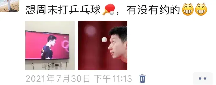 小時候我是挺喜歡打乒乓球的,但是后面打的比較少,直到21年東京奧運會,看完馬龍奪冠后,特別想要去打乒乓,于是我就發(fā)了個朋友圈,從此開啟了我的乒乓球之路,現(xiàn)在結(jié)交了很多愛打乒乓球的朋友,特別感謝那時候看那場比賽。