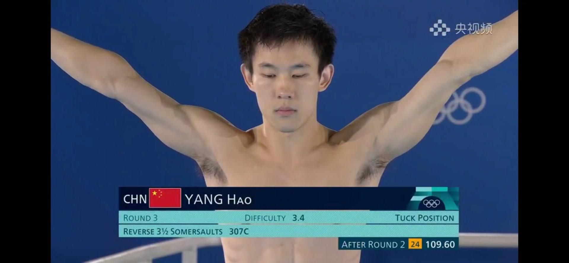 楊昊的晉級過程略有波瀾,他第二跳626B(臂立向后翻騰三周屈體)嚴重失誤,只得到28分,一度排名跌落第24位。不過,今年2月在多哈世錦賽奪得這個項目冠軍的楊昊調整能力極強,他后面4跳得分全部在85分以上,最后一跳更是得到全場最高的99.90分,一路追至第4名完賽。