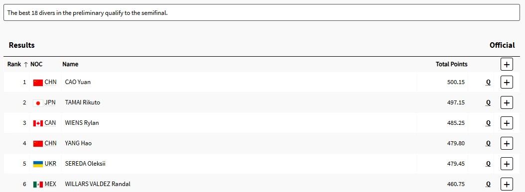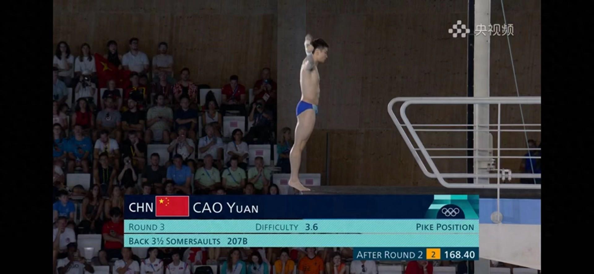 這場預賽共有26名選手參加,前18名有資格晉級半決賽。第四次參加奧運會的老將曹緣第一跳后排名第一,雖然此后兩跳略有起伏,一度排名第7位,但他后面找到狀態,從第4跳后一直排名第一,最終得到500.15分晉級。