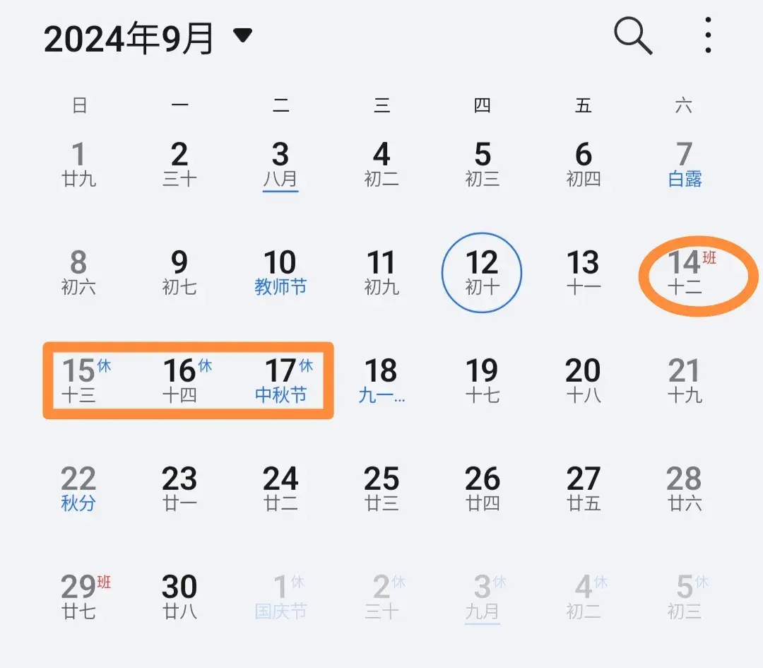 2024年中秋節在9月份,調休:9月14日(星期六)上班;放假:9月15日至9月17日放假,共3天。