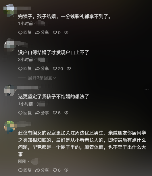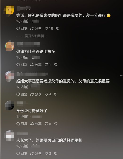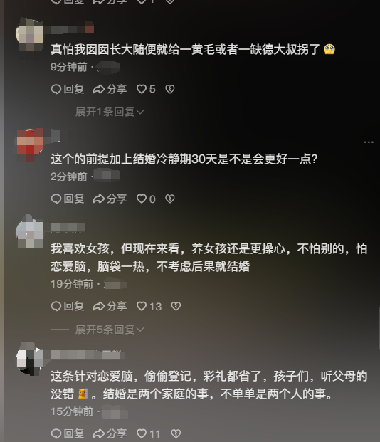 有的網友在評論區說:我喜歡女孩,但現在來看,養女孩還是更操心,不怕別的,怕戀愛腦,腦袋一熱,不考慮后果就結婚。如果一個男生他自身優秀是不會經歷天價彩禮的,也不會在市面流通,在學校,或者剛出社會就被預定了,天價彩禮只是女方家長看不上男方,讓他知難而退的手段。讓戀愛腦結婚,讓理智的人更慎重考慮結婚。結婚率低不是因為彩禮的問題,畢竟天價彩禮是少數現象,更多的是因為結婚就要承擔很多的責任,需要有掙錢的能力,需要良好的經濟支持,如果工作不行,掙不到錢,怎么去買房、扶養孩子、教育孩子、贍養老人,很多事情都是需要成本的。