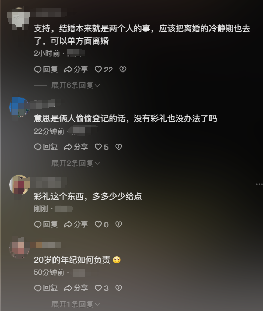 還有的網友說:建議有一次結婚證撤回的機會,三年內可撤回不留痕,既緩解彩禮問題,也能提升幸福指數。80 后的婚姻都是父母做主的,到了我們做父母就做不主了,哎!反正我不同意。起碼爭取雙方父母同意,因為婚姻不僅僅兩個人的事!彩禮就相當于驗資,是最能考驗男方態度的,當然獅子大開口的除外。家里天天催婚,等會就告訴家里我結婚了。