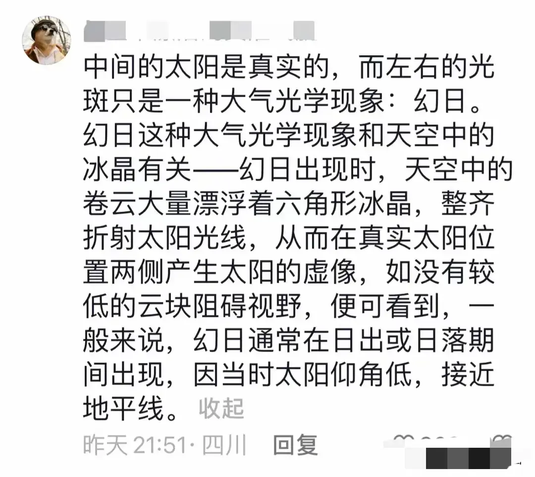 網友們那叫一個熱鬧,七嘴八舌地說個不停。有人驚訝得下巴都快掉了,直說這簡直是一輩子都難碰上的奇景。也有人開動腦筋,琢磨著到底是咋回事。不少人覺得,這可能是少見的幻日現象。