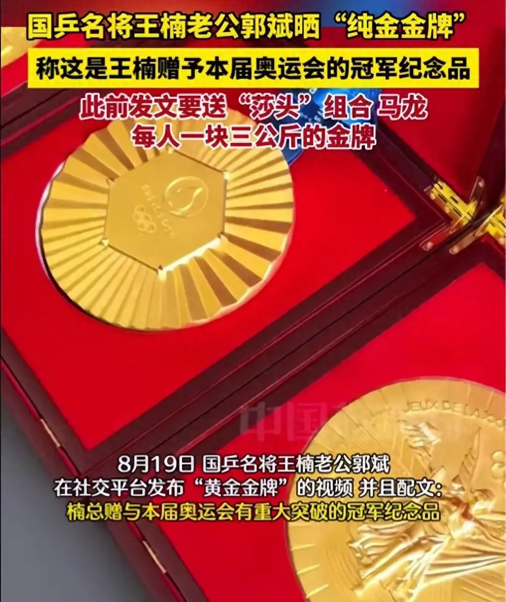 王楠夫婦贈送了3公斤金牌與巴黎奧運會的金牌很相似,這也算是對孫穎莎、王楚欽和馬龍對國乒付出的贊揚。