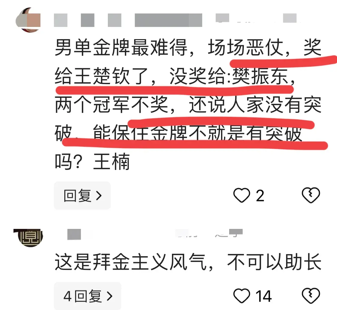 網友表示,男單金牌最難得,場場惡仗,最后打敗張本,可金牌卻獎給王楚欽了,沒獎給樊振東,兩個冠軍不獎,還說人家沒有突破,能保住金牌不就是有突破嗎?