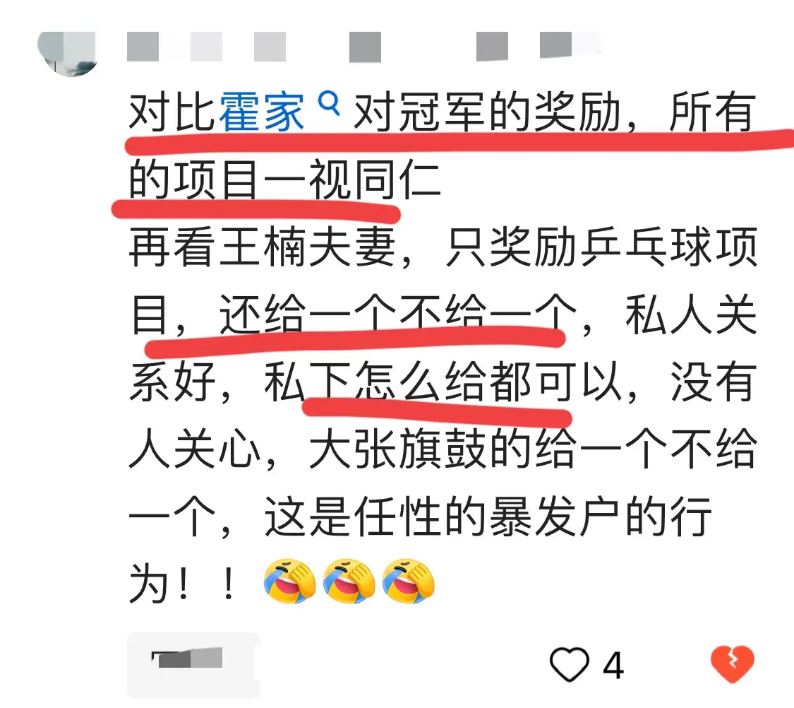 有網友甚至將王楠與霍家給奧運冠軍的獎勵進行對比:霍家對冠軍的獎勵,所有的項目一視同仁,再看王楠夫妻,只獎勵乒乓球項目,還給一個不給一個,私人關系好,私下怎么給都可以,沒有人關心,大張旗鼓的給一個不給一個,這是任性的暴發戶的行為!