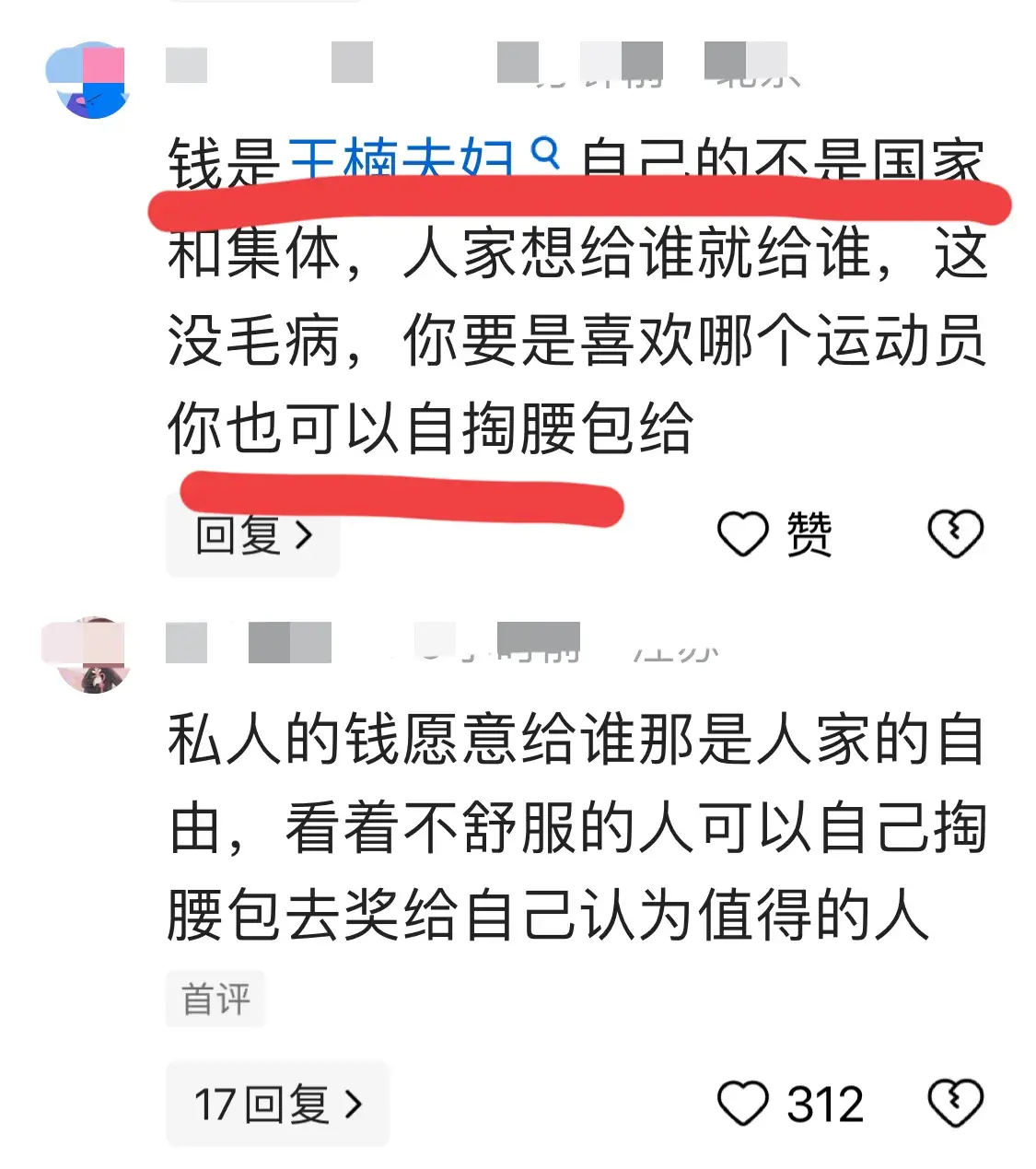 也有網友說:這個買金牌的錢是王楠夫婦自己私人出的,人家想給誰就給誰,這沒毛病,你要是喜歡哪個運動員你也可以自掏腰包給!別沒給你心目中的人買金牌就在這里酸!