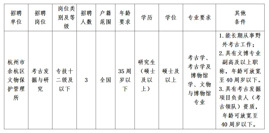 7.年齡應在35周歲以下(1988年8月28日后出生)。具備文博專業副高以上職稱者,或具備考古發掘項目負責人(考古領隊)資質者,年齡可放寬至40周歲以下(1983年8月28日后出生);