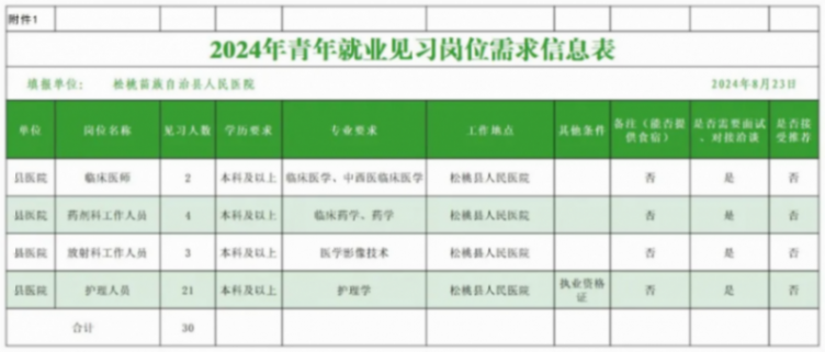 根據《省人力資源社會保障廳關于實施好2024年青年就業見習萬崗募集計劃和高校畢業生創業扶持計劃的通知》(黔人社函〔2024〕11號)、《市人力資源和社會保障局關于實施好2024年青年就業見習萬崗募集計劃的通知》等文件精神,為切實幫助離校未就業的高校畢業生和失業青年積累工作經驗、增強實踐能力、促進實現就業,我院共設置青年就業見習崗位60個,包含臨床、護理、醫技等崗位,現公告如下: